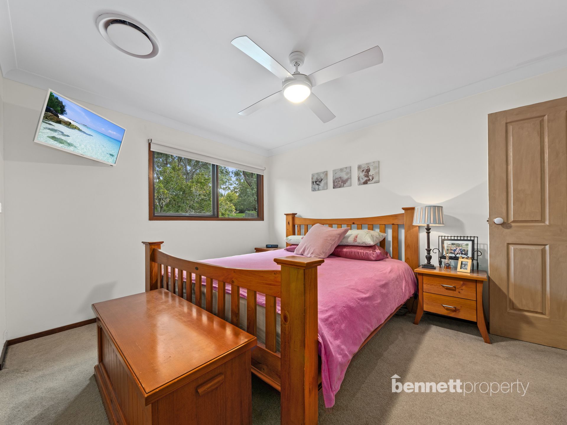 The six-bedroom home boasts generous living spaces on both levels, accompanied by an entertainment deck and swimming pool. All bedrooms have built-in cupboards and ceiling fans. The master suite has an oversized walk-in wardrobe. Quality timber kitchen featuring stainless steel appliances, a 900mm (approx.) oven with gas cooktop, and a stainless steel fridge.