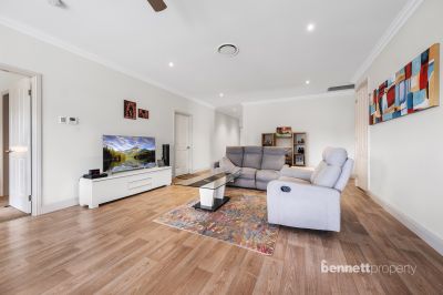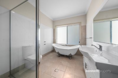 With a flattering street appeal, the home offers high ceilings, a generous open-plan living area, a separate media room, ceiling fans, and ducted air-conditioning throughout. Large modern kitchen with island bench, stone bench tops, great storage, well-sized pantry and stainless-steel appliances including dishwasher. All bedrooms have built-in wardrobes, and the main bedroom has an ensuite. The main bathroom has a claw-foot bathtub.