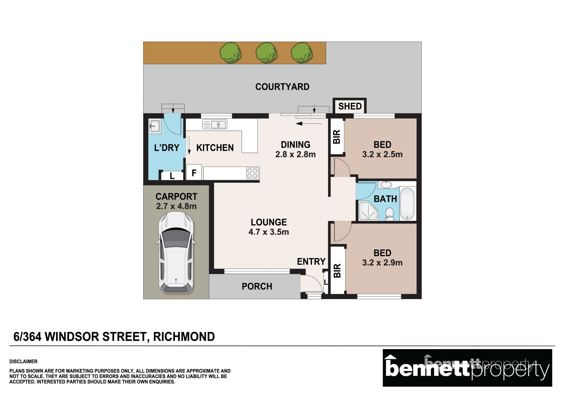 Outside offers a sunny, low-maintenance paved courtyard with NO MOWING. Single carport for car accommodation and storage shed.